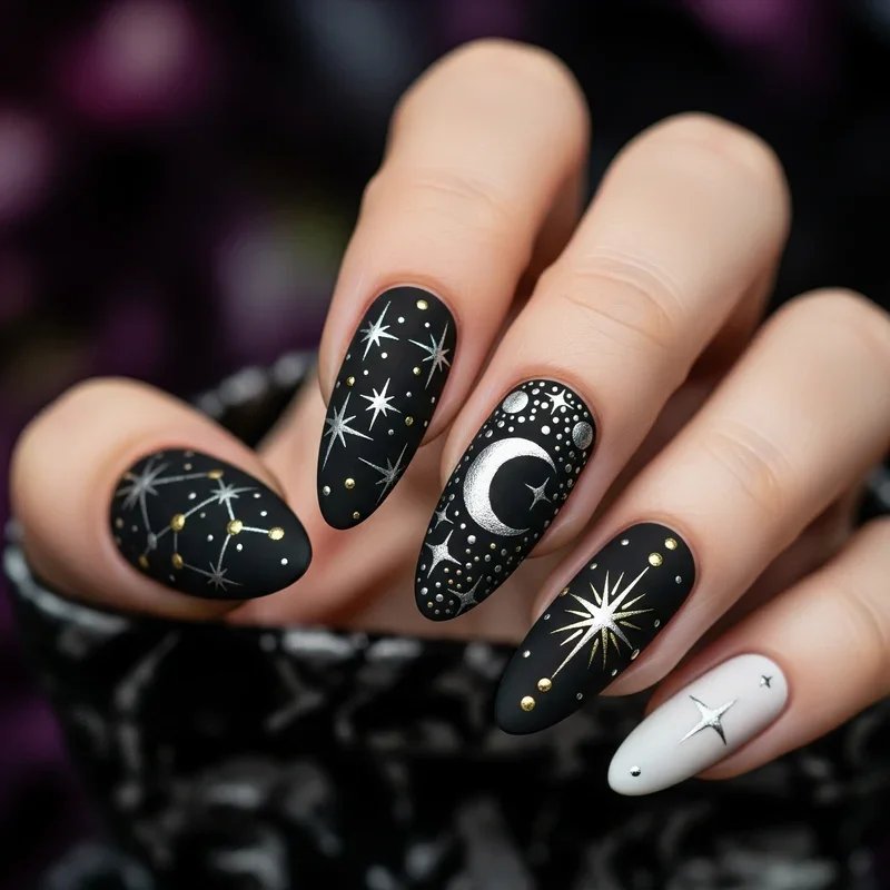 Channel your inner moon child with celestial designs featuring crescent moons, stars, and cosmic elements against dark backgrounds. This mystical approach to goth nails connects you with the night sky and all its mysterious beauty. Use metallic silver or gold for the celestial bodies against deep black or midnight blue bases for maximum impact. The placement of these elements can tell different stories; scattered stars create a galaxy effect while organized patterns feel more mystical and intentional. Consider adding constellation patterns that hold personal meaning or zodiac symbols for a customized touch. These designs remind us that darkness isn't empty; it's full of light waiting to be discovered. The celestial theme has deep roots in gothic romanticism, representing the eternal dance between light and shadow.