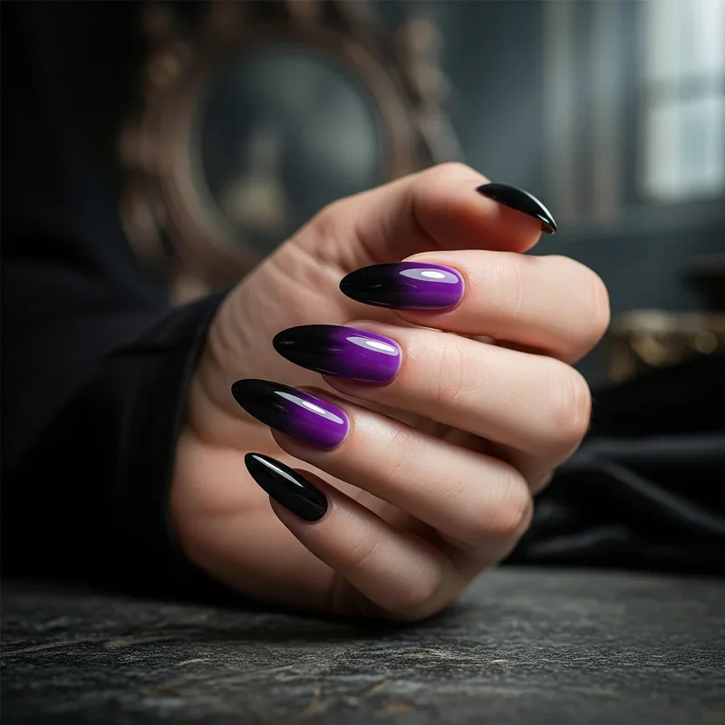 Blend the mystical allure of deep purple with the absolute darkness of black in an ombre effect that's both subtle and striking. This gradient technique creates depth and dimension that plain solid colors simply can't achieve. Start with your purple at the base and gradually blend into black at the tips, or reverse it for a different vibe. The secret to a flawless ombre is using a makeup sponge and working quickly while the polish is still wet. Purple and black together evoke images of twilight skies and gothic royalty, making this combination a favorite among dark fashion enthusiasts. Add some holographic topcoat for an extra magical touch that catches light like distant stars. This color combination has deep roots in gothic culture, representing the transition between day and night, life and death.