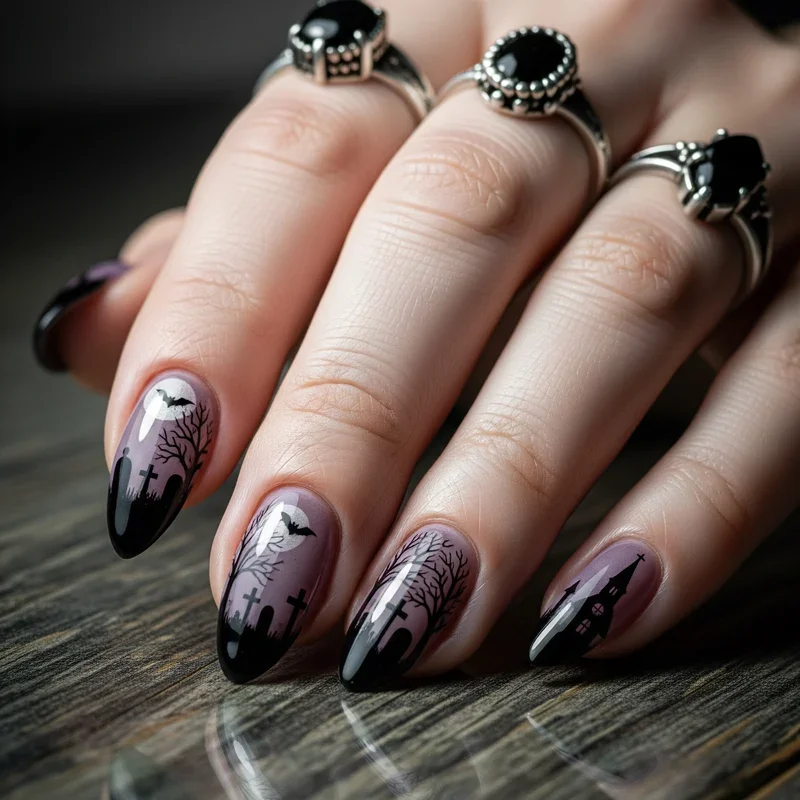 Transport yourself to a moonlit graveyard with cemetery silhouette nail art that captures the haunting beauty of gothic landscapes. Picture tiny tombstones, bare trees, and wrought iron gates painted in black against gradient backgrounds of purple, grey, or deep blue. This design tells a story on each nail, creating a panoramic scene across your fingertips. The key to success here is starting with the background gradient and adding silhouettes once completely dry. Use a thin brush or nail art pen for precise details like cross shapes and tree branches. This design particularly shines when you add a touch of shimmer to represent moonlight or fog. Each nail becomes a window into a gothic fairy tale, celebrating the romantic darkness of cemetery aesthetics that have inspired gothic culture for generations.