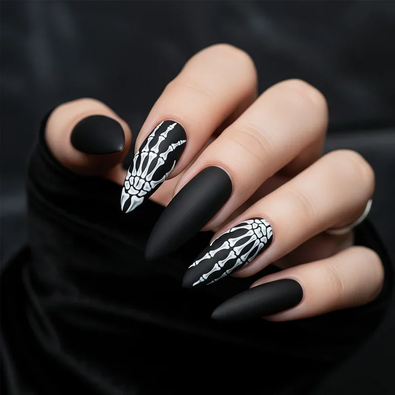 Make a bold statement by painting skeletal hands or bones on select accent nails while keeping others solid black or deep grey. This anatomical approach to nail art showcases your appreciation for the macabre while maintaining wearable sophistication. The trick is getting the proportions right; skeleton fingers should align with your actual fingers for maximum impact. White polish on black creates the strongest contrast, though silver or grey can offer a more subtle approach. You can extend the design to show skeleton hands grasping or reaching across multiple nails for a cohesive look. This design works exceptionally well for those who want to showcase their love for anatomy and gothic aesthetics simultaneously. The skeletal imagery reminds us of our mortality while celebrating the intricate beauty of our internal structure.