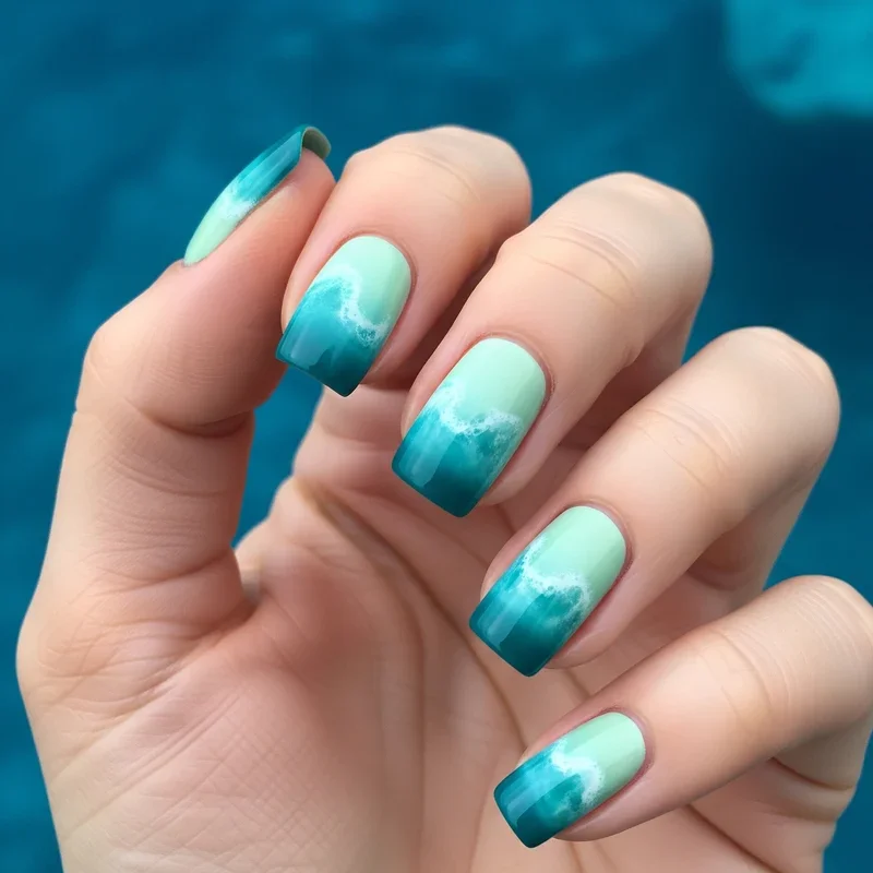 Picture the gorgeous gradient where ocean meets shore, and you've got seafoam ombre nails! This dreamy design transitions from pale, almost white green to deeper aqua tones, creating a soothing, beachy vibe that's perfect year-round. The beauty of ombre lies in its soft, blended appearance that looks way more complicated than it actually is. Using a makeup sponge, you can achieve this gradient effect at home with a bit of practice. Start with the lightest shade at the tips and gradually blend darker toward the cuticle, or reverse it for a different look. Seafoam ombre pairs beautifully with silver jewelry and gives off major mermaid vibes. It's the perfect choice when you can't decide between different shades of green!