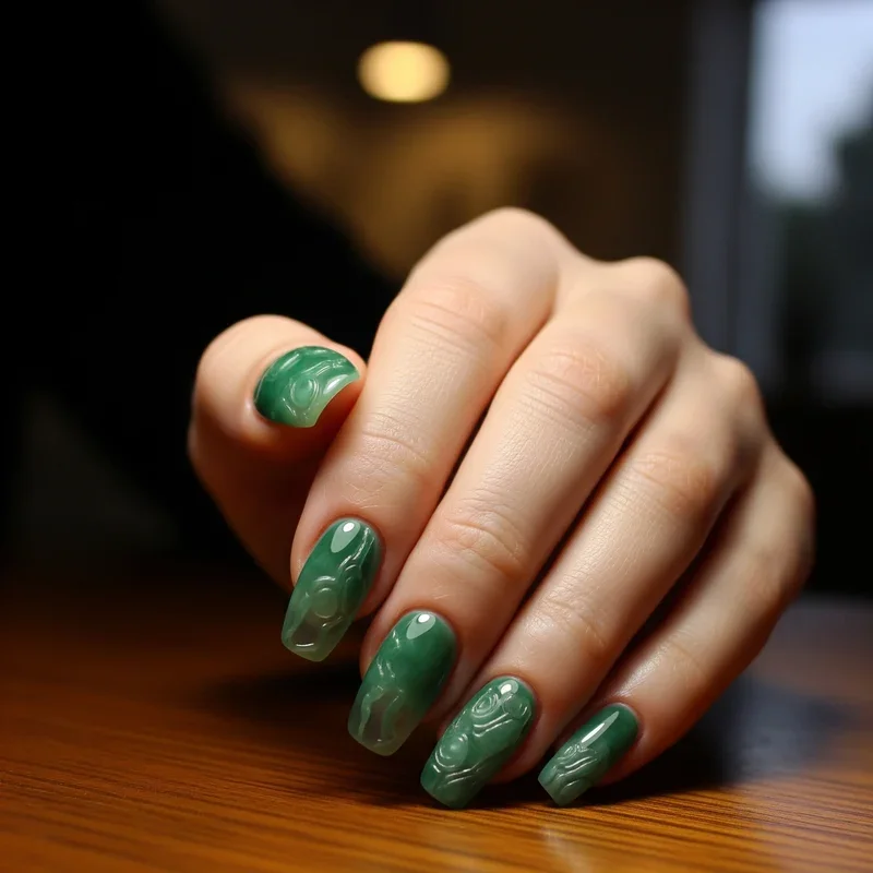 Channel your inner earth goddess with jade stone effect nails that look like you're wearing actual gemstones! This technique recreates the natural veining and depth of real jade, complete with subtle variations in color and texture. The result is absolutely mesmerizing. Creating the jade effect involves layering different shades of green with white or gold veining, often using a thin brush or even a toothpick. Some nail artists add a glossy topcoat to mimic the polished surface of real jade. This luxurious look pairs beautifully with gold accessories and gives off major expensive energy. It's perfect for special occasions or when you simply want to feel extra fancy during your regular Tuesday.