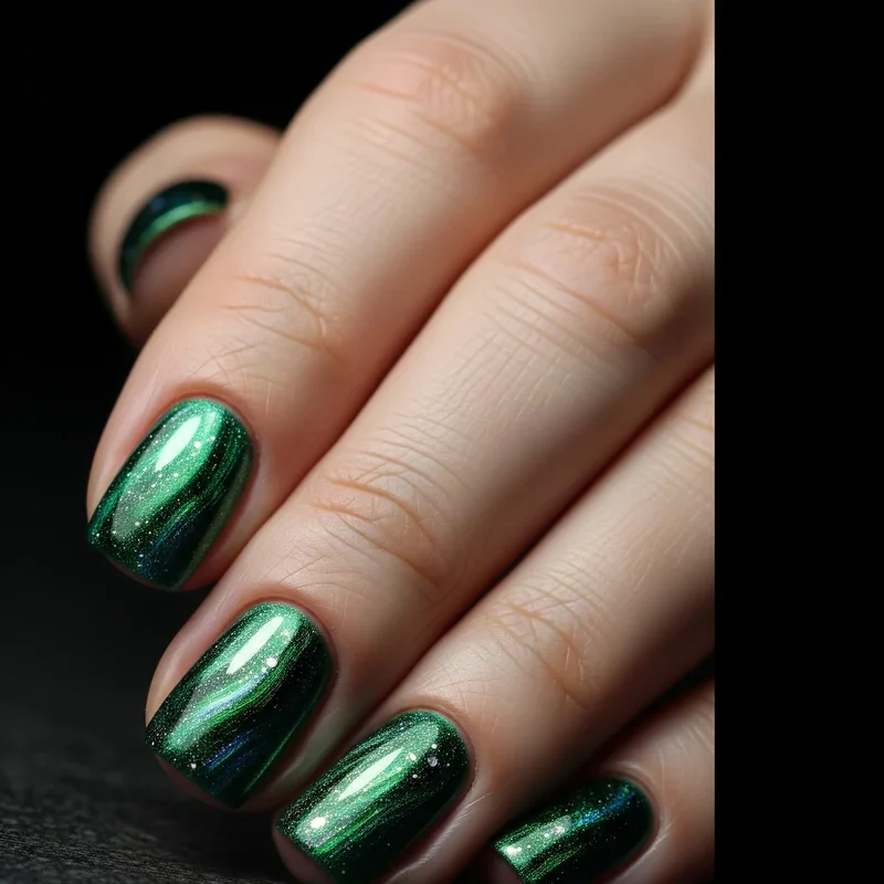 Ready to take your nails to outer space? Metallic green galaxy nails combine the shimmer of stardust with the mystery of deep space, creating an otherworldly effect that's absolutely hypnotic. This design typically features a dark green base loaded with metallic particles, holographic glitter, and sometimes even color-shifting elements. The key to achieving that galaxy effect is layering. Start with a black or deep green base, then sponge on metallic green polish, adding spots of lighter greens and even purples or blues. Finish with holographic topcoat or loose glitter for maximum sparkle. These nails are perfect for parties, concerts, or whenever you want to feel like an intergalactic princess. They catch light beautifully and create different effects from every angle.
