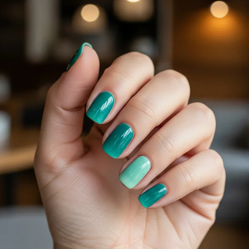 Where blue meets green, magic happens! Teal-green gradient nails offer the best of both worlds, creating a stunning transition that captures the essence of tropical waters and peacock feathers. This sophisticated color blend adds depth and interest to your manicure without requiring complex nail art skills. The gradient can run from finger to finger, creating a subtle rainbow effect, or from base to tip on each nail for a more dramatic look. The blue undertones in teal make it especially flattering on cool skin tones, while the green keeps it grounded and wearable. This design is perfect for those who want something unique but not too wild. Add some shimmer or glitter to really make those colors dance in the light!