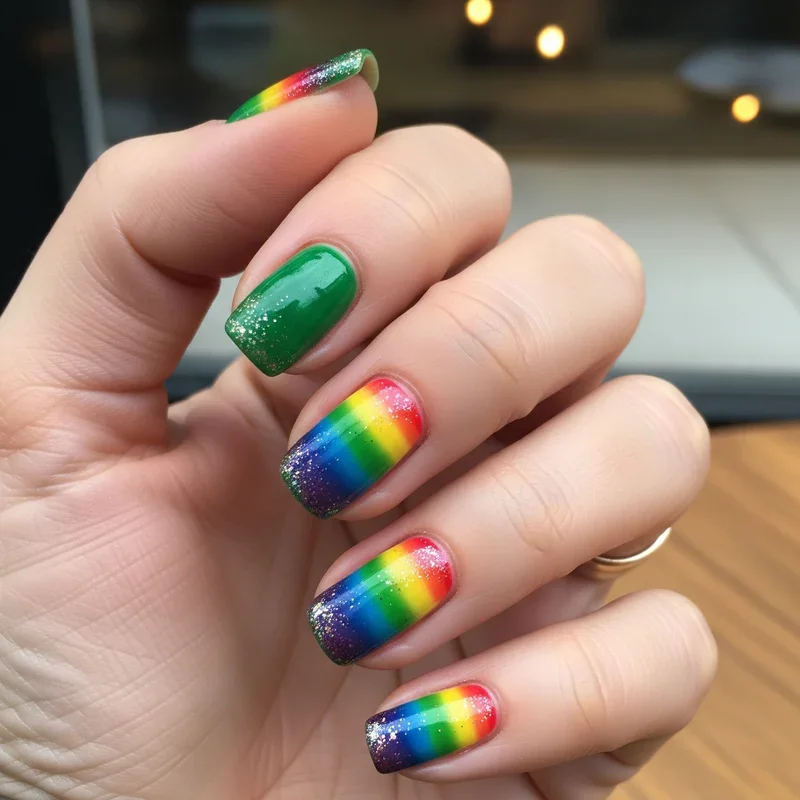 Why choose just one shade when you can have them all? Mixed green rainbow nails celebrate every gorgeous tone in the green family, from palest mint to deepest forest. Each finger sports a different shade, creating a cohesive yet playful manicure that's guaranteed to spark conversations. The trick to making this look work is choosing shades that flow naturally from one to another. Start with the lightest green on your thumb and gradually move through the spectrum to the darkest on your pinky, or mix them up for a more random effect. This design is perfect for the indecisive nail art lover who wants to try multiple trends at once. It's also a great way to use up those random green polishes in your collection!