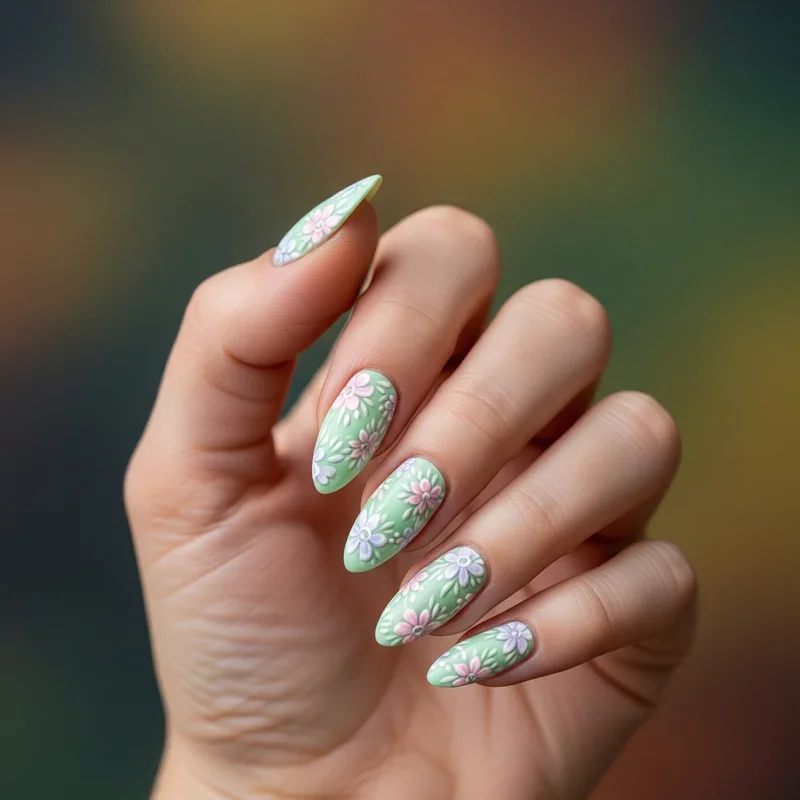 Spring called, and it wants you to try pastel green floral nails! This sweet, romantic design combines soft mint or sage base colors with delicate flower patterns in complementary shades. It's like wearing a miniature garden party on your fingertips. The beauty of pastel green florals lies in their feminine charm without being overly saccharine. You can go for realistic roses and daisies or opt for more abstract, watercolor-style blooms. White, pink, and lavender flowers look particularly stunning against a pale green background. This design is perfect for weddings, baby showers, or any time you want to channel your inner romantic. For a modern twist, try combining traditional florals with geometric elements or negative space for an updated take on this classic look.