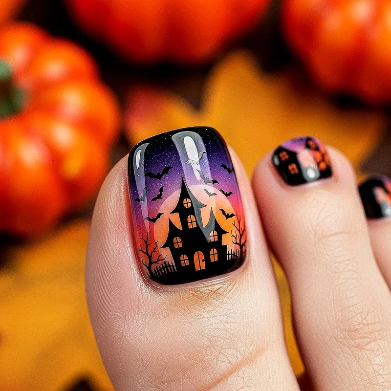 Transform your toes into a spooky neighborhood with these haunted house silhouettes against dramatic sunset backgrounds. Start by creating an orange to purple gradient base that mimics a Halloween sunset, then use black polish to paint simple house shapes with crooked chimneys and pointed roofs. Add yellow squares for lit windows and maybe a tiny witch or bat flying past for extra atmosphere. The beauty lies in making each house slightly different, creating a whole haunted street across your ten toes. Use a thin brush to add bare tree branches or a picket fence for additional detail. This artistic design tells a story and showcases your creative skills while capturing Halloween atmosphere.