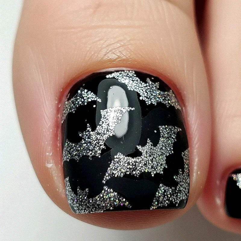 Let your toes take flight with these sparkling bat silhouettes that combine Halloween spookiness with glamorous glitter. Start with a deep purple or midnight blue base, then apply black bat silhouettes using nail stickers or freehand painting for the more artistically inclined. The magic happens when you outline or fill these bats with black glitter polish, creating a textured effect that catches the light beautifully. Vary the size and position of the bats across your toes, having some in full flight and others perched for visual variety. Consider adding a full moon on your big toe using silver or white polish as a backdrop for your bat colony. This design perfectly balances gothic elegance.