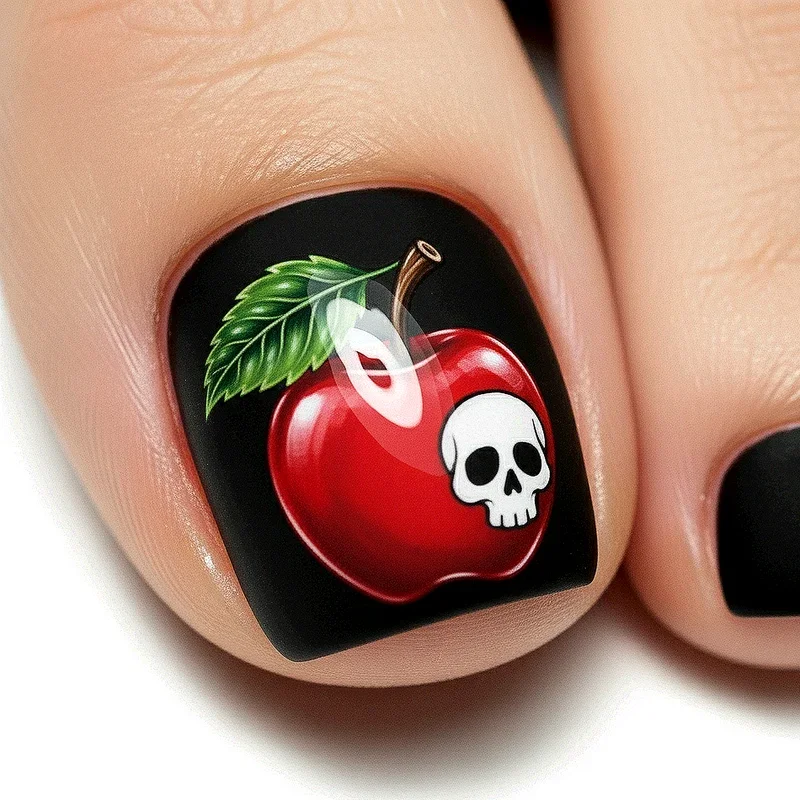 Take a bite out of style with these wickedly beautiful poison apple designs inspired by fairy tale villainy. Paint your nails in deep, glossy red to represent the apple's skin, then add a small black or dark purple drip from the top to suggest poison. Create tiny white highlight spots to give that fresh apple shine, and perhaps add a small green leaf at the base. For your big toes, consider adding a tiny skull symbol or the word "poison" in miniature gothic lettering. The contrast between the beautiful red apple and the sinister poison element perfectly captures Halloween's mix of beauty and danger. This design especially suits those channeling their inner evil queen.