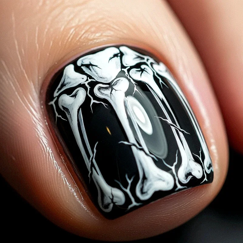 Get ready to rattle some bones with this anatomically playful design that turns your toes into tiny x-rays. Paint a solid black base to represent the darkness, then use white polish to create simple bone shapes like femurs, ribs, or skull fragments on each nail. The key is keeping the bone designs simple yet recognizable since you're working with limited space on toe nails. You can connect bones across multiple toes to create a fuller skeleton effect or keep each nail independent with different bone types. Adding a touch of gray shading gives the bones more dimension and realism. This design works especially well for skeleton costumes or Day of the Dead celebrations.