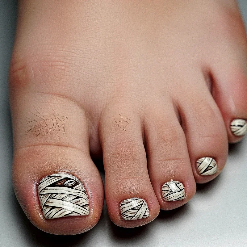 Unwrap some serious style with this mummy-inspired design that's surprisingly easy to achieve yet looks incredibly detailed. Begin with a white or off-white base coat, then use a thin brush to create crisscrossing bandage lines with a slightly darker beige or gray polish. The randomness of the wrap pattern is what makes this design authentic, so don't worry about perfect lines or spacing. Add two small black dots or googly eye nail stickers peeking through the bandages on your big toes for that classic mummy look. For extra texture, try using a matte top coat on the bandages while keeping the eyes glossy. This playful design brings ancient Egyptian horror to life.