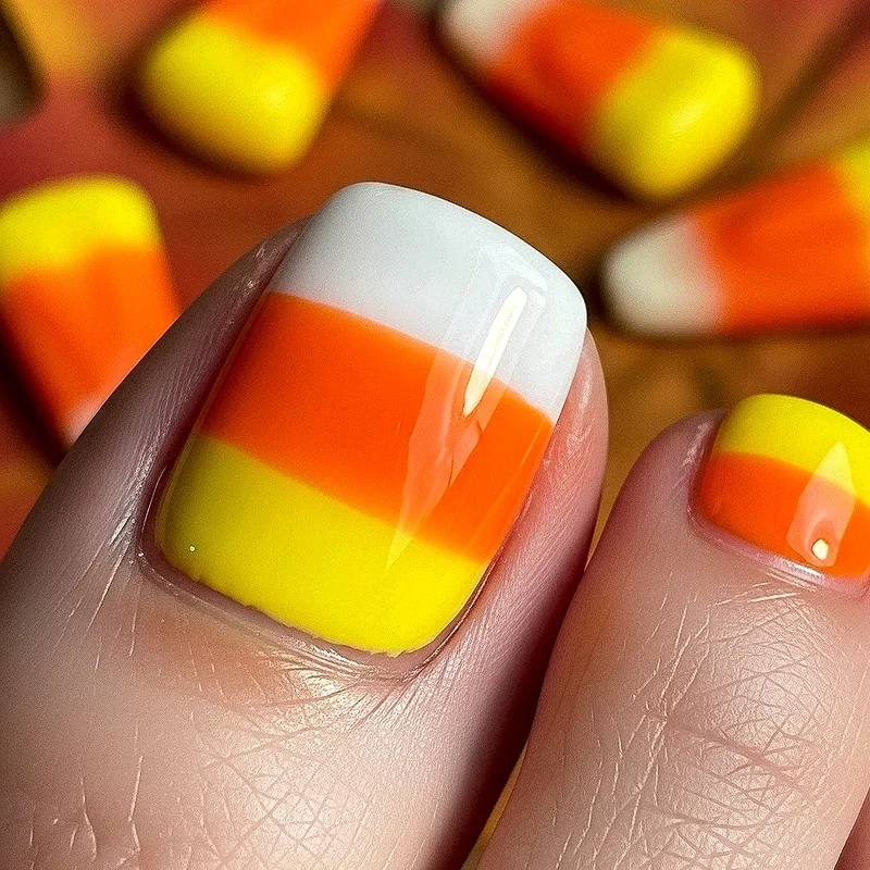 Sweet tooths rejoice because this candy corn inspired design brings everyone's favorite controversial Halloween treat straight to your toes. Create the classic tri-color pattern with white tips, orange middles, and yellow bases, just like those triangular candies we either love or hate. The trick is getting those lines perfectly straight and evenly spaced, which you can achieve using thin striping tape or nail guides. What makes this design particularly fun is how you can play with the orientation on different toes, having some pointing up and others sideways for visual interest. For a modern twist, try using glitter versions of these colors or add a matte top coat for sophistication. This nostalgic design instantly evokes Halloween.
