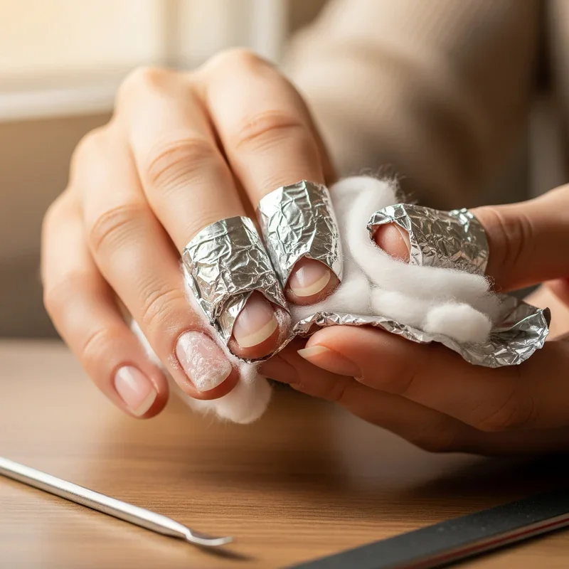 After your timer goes off, remove one foil wrap to check the progress. The gel should look like it's bubbling up or sliding off the nail. If it's ready, use your orange stick or cuticle pusher to gently nudge the polish off. It should slide away easily, like butter melting off warm bread.