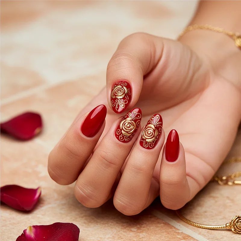 Nothing screams Latina confidence quite like a bold red manicure enhanced with delicate gold details that catch the light with every gesture. This timeless combination pays homage to the passion and warmth that runs through our veins while adding that touch of luxury we all deserve. You can create this look by applying a rich crimson base coat and adding thin gold stripes, dots, or even tiny roses using a detail brush or nail stamps. The beauty of this design lies in its versatility, working perfectly whether you're closing deals in the boardroom or toasting with champagne at your cousin's wedding. Think of it as your signature power move, like that perfect red lipstick your abuela always wore.