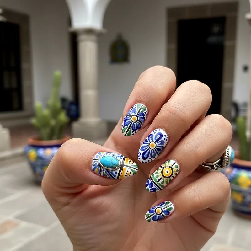 Transform your nails into miniature ceramic masterpieces inspired by the traditional blue and white Talavera tiles that adorn colonial buildings throughout Mexico. These intricate patterns featuring florals, geometric shapes, and scrollwork create an elegant and timeless look that brings old-world charm to your modern style. Start with a crisp white base and use royal blue polish to paint delicate designs, adding touches of yellow or orange for authentic detail. The symmetry and precision required for this style make it a true art form, but nail stamps can help achieve the look more easily. Each nail becomes a tiny piece of architectural history you carry with you.