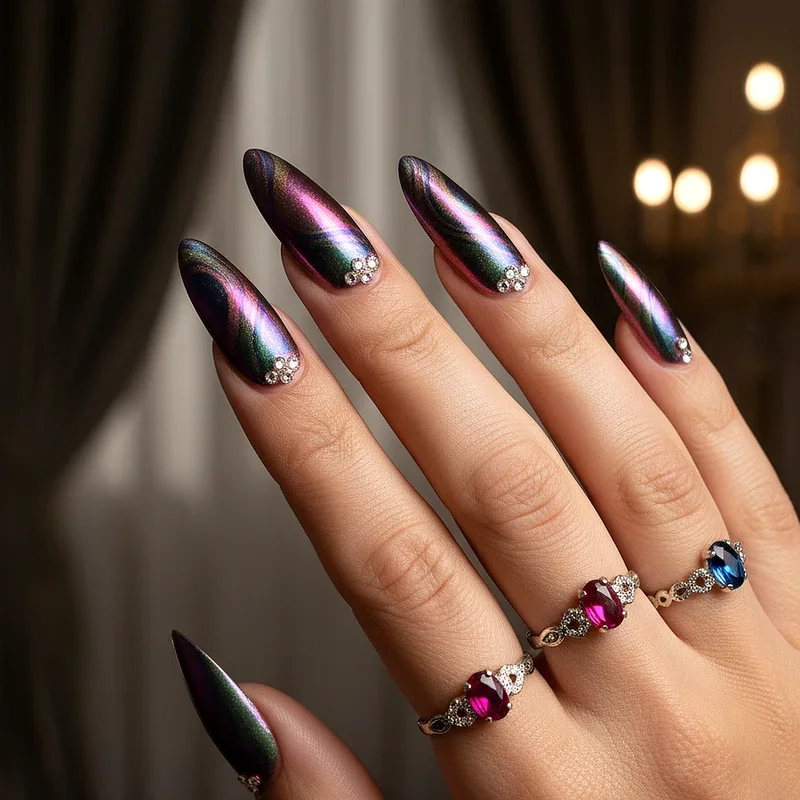 Channel the glamour and drama of your favorite telenovelas with mirror-like chrome nails that reflect light like the tears of a protagonist discovering her true parentage. This ultra-modern technique uses special chrome powders rubbed over gel polish to create an impossibly smooth, metallic finish in colors ranging from classic silver to rose gold or even holographic effects. The high-impact look requires minimal decoration because the finish itself steals the show, much like those dramatic zoom-ins during pivotal novela moments. These nails scream luxury and sophistication while maintaining that over-the-top flair we secretly love. Every hand gesture becomes a dramatic reveal worthy of prime time.