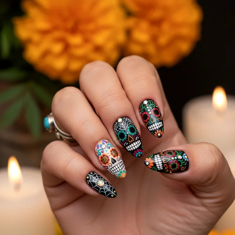 Celebrate life and death in true Mexican tradition with intricate sugar skull designs that turn your nails into miniature works of art honoring our beloved departed. These detailed designs feature colorful flowers, hearts, and swirls painted over a white or black base, creating a festive yet meaningful manicure that goes beyond mere decoration. Using ultra-thin brushes or nail stamps, you can add roses, crosses, and geometric patterns in vibrant purples, pinks, and blues that pop against the base color. This style perfectly captures the joyful remembrance that characterizes DĂa de los Muertos, allowing you to carry the spirit of this beautiful tradition year-round. Your nails become tiny altars celebrating the circle of life.