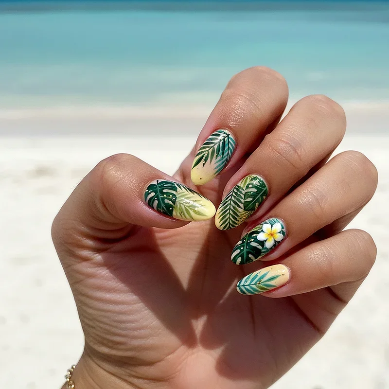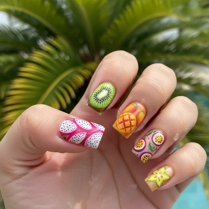 Celebrate the abundance of tropical fruits that flavor our cuisine and culture with playful nail art featuring tiny papayas, mangoes, pineapples, and passion fruits. Paint each nail with a different fruit design over bright, complementary backgrounds, or create a fruit salad effect across all ten fingers using detailed brushwork or decals. The vibrant yellows, oranges, and greens instantly lift your mood and remind you of fresh juice on a hot day or fruit cups sprinkled with chile and lime. Add texture with glossy top coats to mimic the juicy sheen of ripe fruit, or incorporate tiny seeds and leaf details for extra authenticity. Mix in palm leaves or sunset gradients as accent nails to complete the tropical paradise vibe.