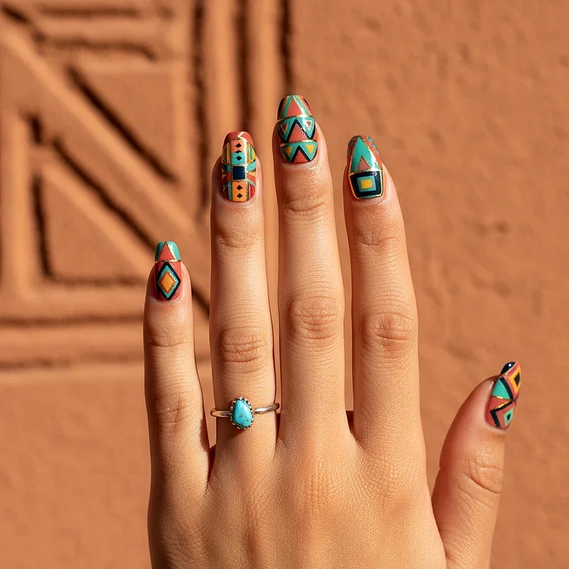 Channel the ancient wisdom and artistry of our indigenous ancestors with bold geometric patterns that transform your nails into miniature archaeological treasures. These intricate designs featuring triangles, zigzags, and stepped pyramids in earth tones like terracotta, turquoise, and gold create a sophisticated look that honors our pre-Hispanic roots. You can achieve this style using nail tape for crisp lines or freehand if you're feeling adventurous, mixing matte and glossy finishes for added dimension. The structured patterns provide a modern twist on traditional motifs, making them perfect for the contemporary Latina who walks confidently between two worlds. Each nail becomes a tiny monument to our rich cultural heritage.