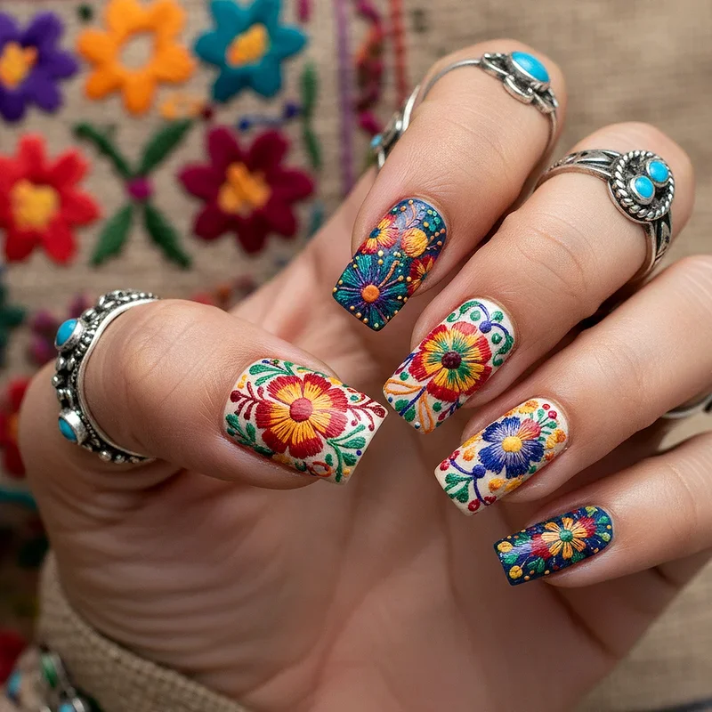 Honor the intricate needlework traditions passed down through generations by recreating embroidery patterns on your nails with precise detail and vibrant colors. These designs featuring flowers, vines, and geometric patterns painted in bright threads of color against white or cream bases celebrate the patience and skill of our abuelas and their abuelas before them. Use dotting tools and thin brushes to create the illusion of stitched patterns, incorporating traditional motifs from your specific heritage, whether Mexican, Guatemalan, or Peruvian. This style connects you to centuries of women who expressed creativity through textiles, now translated to a modern medium. Each nail tells a story stitched in time and memory.