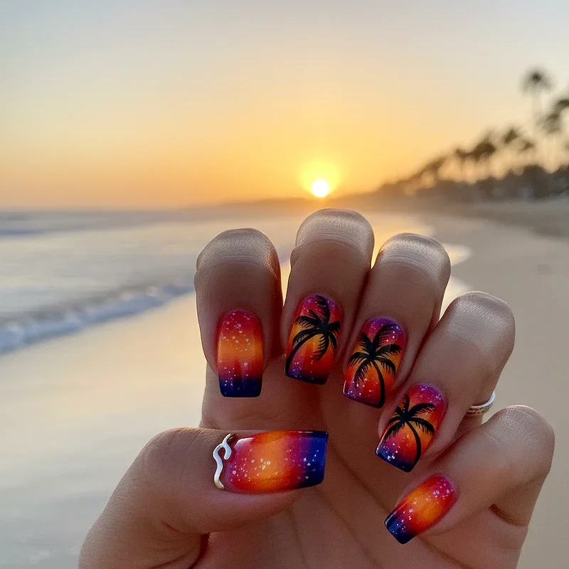 Combine the tranquility of a beach sunset with dramatic palm tree silhouettes for a design that captures those perfect vacation moments we live for. Create an ombre background transitioning from deep purple to orange to yellow, mimicking the sky as the sun dips below the horizon, then add black palm tree silhouettes using a thin brush or stamps. This design brings together the peaceful and passionate sides of Latin culture, representing both our love for natural beauty and our flair for artistic expression. Add tiny birds or a crescent moon for extra detail that makes each nail a complete scene. Your manicure becomes a portable postcard from paradise.