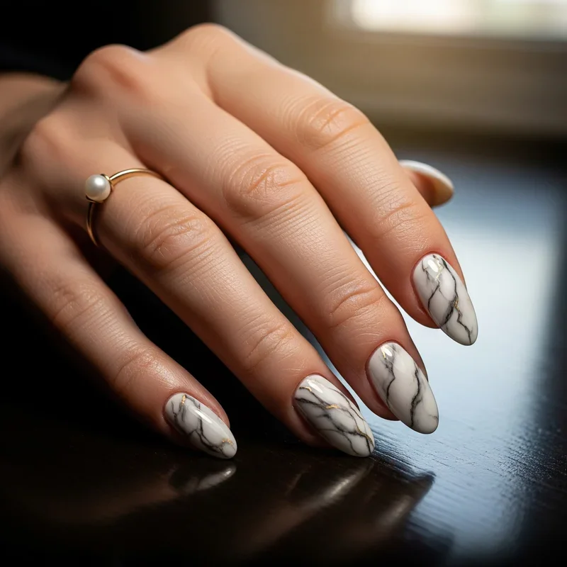 Marble nails look like tiny pieces of art, but you don't need to be Michelangelo to create them. The water marble technique involves dropping different nail polish colors into a cup of room temperature water, swirling them with a toothpick, and dipping your nail through the design. Alternatively, try the dry marble method using a plastic bag. Apply drops of different colors onto the bag, swirl them together, let them partially dry, then press your nail onto the design. Both methods create unique patterns every time, so no two nails will look exactly alike. White, black, and gold create a luxe marble effect, while pastels give a dreamy, ethereal vibe. Seal with a glossy top coat to enhance the marble's depth.