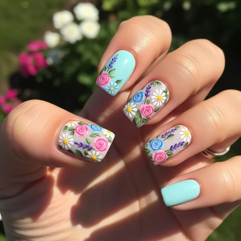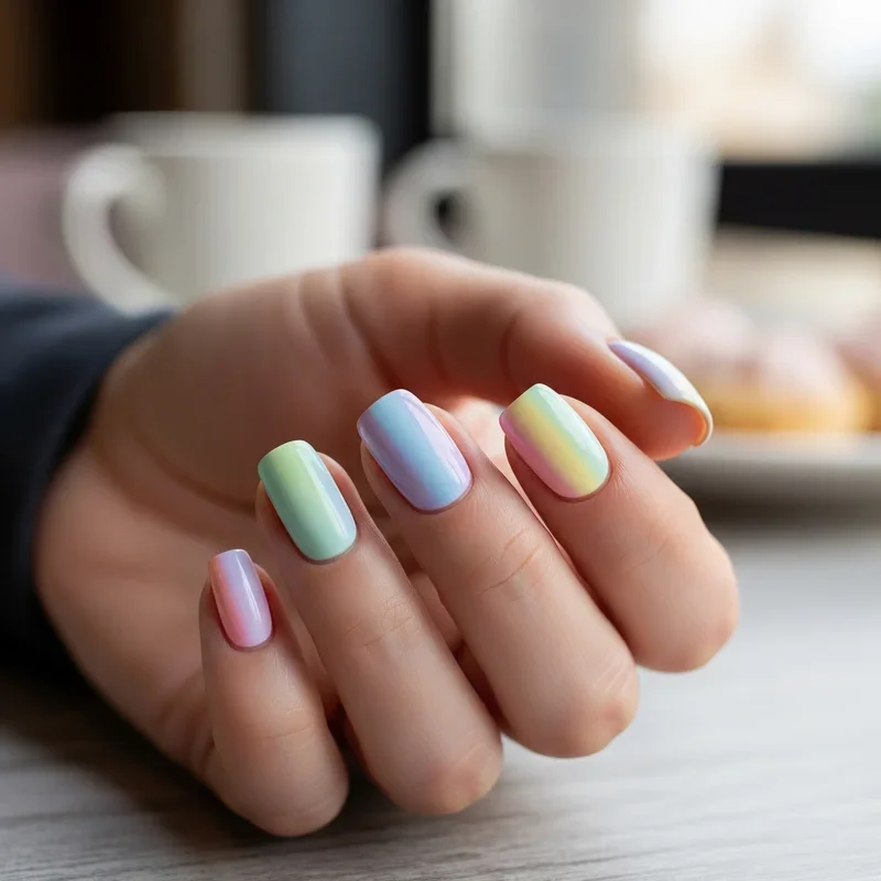 Embrace your colorful side with pastel rainbow nails that are cheerful without being childish. Instead of bright, primary colors, opt for soft pastels like lavender, mint, baby blue, pale yellow, and blush pink. You can paint each nail a different pastel shade or create rainbow stripes on each nail using thin brushes or tape. The muted tones keep the look sophisticated while still being fun and playful. This design works beautifully in spring and summer but can brighten up any gloomy day year-round. For extra dimension, try adding a matte top coat to some nails while keeping others glossy. The contrast in finishes adds visual interest without requiring any additional design skills. Who says rainbows are just for kids?