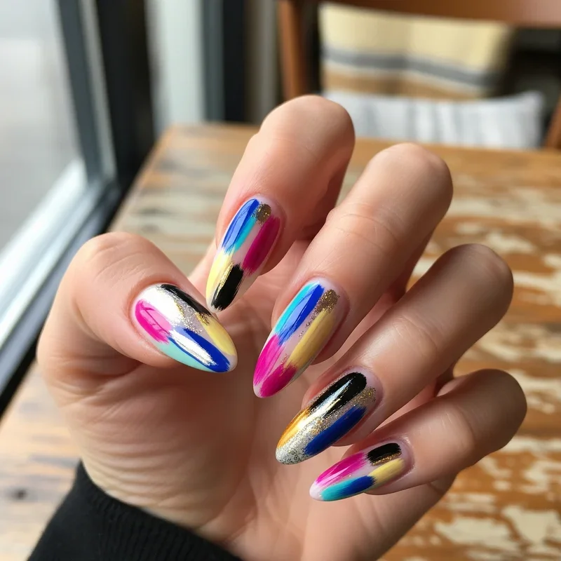 Channel your inner artist with abstract brush stroke designs that are impossible to mess up. Using a thin nail art brush or even a small paintbrush, create random strokes across your nails. The beauty of abstract art? There are no rules! Mix colors, overlap strokes, or keep them separate. You can go for bold, contrasting colors for a statement look or stick to similar tones for something more subtle. This design works especially well on longer nails where you have more canvas space to work with. Try black strokes on a white base for a modern art gallery vibe, or metallic strokes on dark colors for an edgy night-out look. The more random and carefree your strokes, the better the final result.