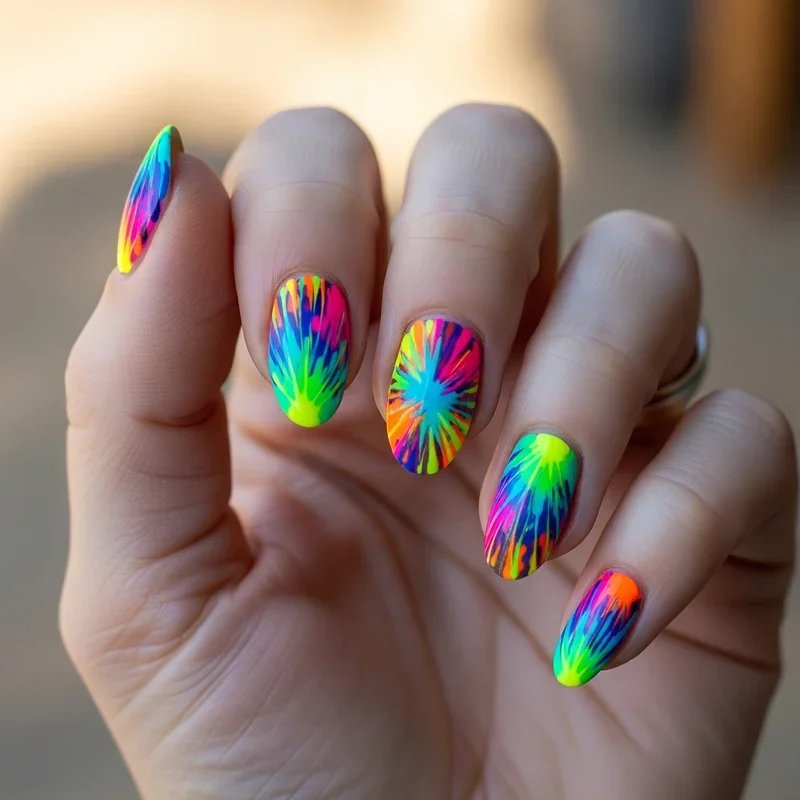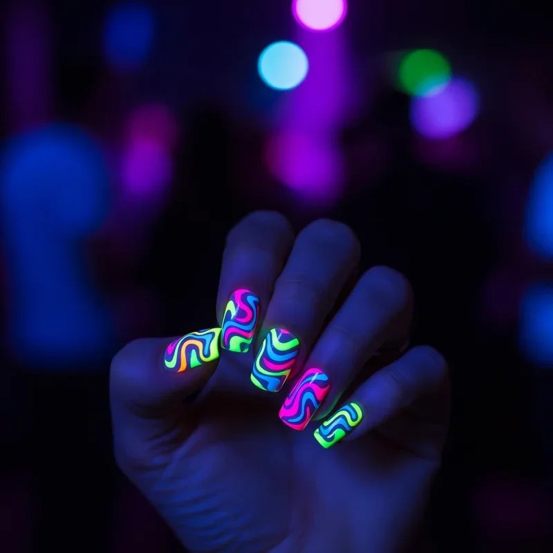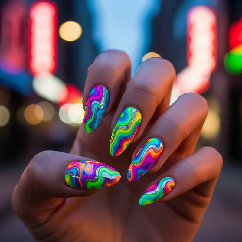 Channel your inner flower child with hypnotic swirl designs that blend multiple neon colors in mesmerizing patterns reminiscent of tie-dye and lava lamps. Water marbling techniques work beautifully here, creating unique patterns on every nail that can't be replicated exactly. Drop different neon polishes into water, swirl with a toothpick, then dip your nails for instant psychedelic art. Alternatively, use a thin brush to create swirls directly on nails for more controlled designs. These patterns capture movement and energy, perfect for free spirits who march to their own beat. The organic flow of colors creates a soothing yet stimulating visual experience that's endlessly fascinating to look at throughout your day.