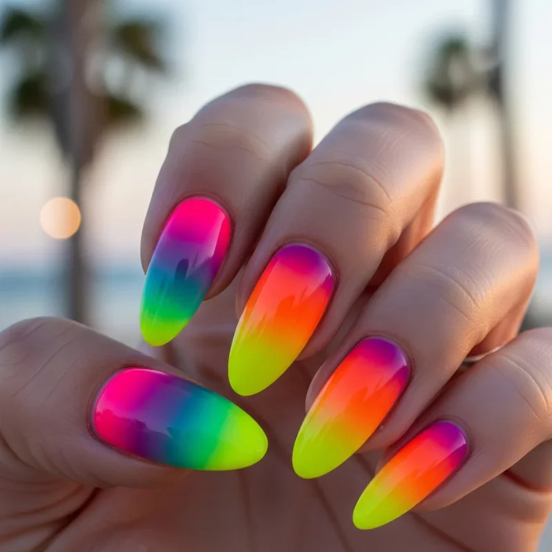 Why choose one neon shade when you can rock them all simultaneously? Rainbow nails celebrate color diversity by featuring different neon hues on each finger or creating rainbow patterns within single nails. You might paint each nail a different solid neon, create vertical rainbow stripes, or blend all colors in psychedelic swirls. This maximalist approach suits bold personalities who believe more is definitely more. The trick involves choosing neons that complement rather than compete, creating harmonious chaos that somehow just works. Add glitter between colors for extra sparkle that ties everything together. These designs guarantee compliments and conversations, making them perfect for parties, pride events, or days when you need serious mood elevation.