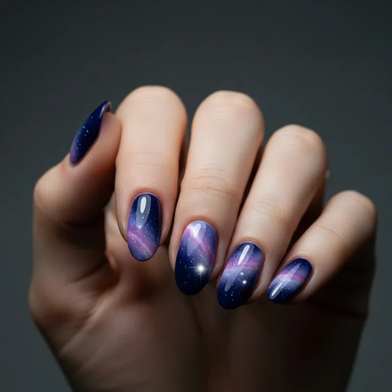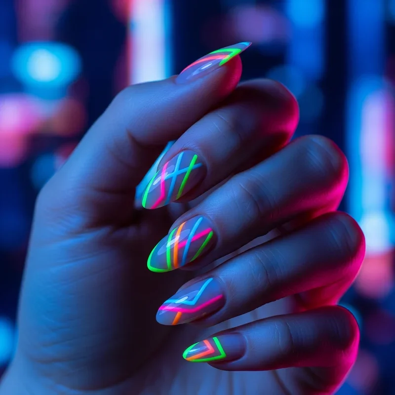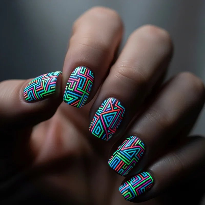 Transport your fingertips to another dimension with cosmic designs featuring neon nebulas, electric stars, and fluorescent planets swirling across dark backgrounds. Black or deep navy bases make neon colors pop like actual celestial bodies floating in space. Sponging techniques create beautiful nebula effects while tiny dots of neon polish mimic distant stars. Add some holographic glitter for extra dimensional depth that catches light like real stardust. You can even incorporate glow-in-the-dark polish for nails that literally shine in darkness, perfect for late-night adventures or concerts. This design appeals to dreamers and science fiction fans who want their manicure to tell a story about infinite possibilities and cosmic wonder.