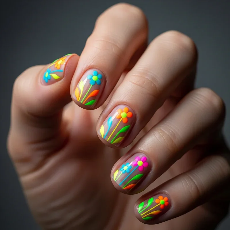 Traditional floral nail art gets an electric makeover when rendered in blazing neon colors that would make any garden jealous. Picture roses in hot pink, daisies in electric yellow, or abstract blooms in every fluorescent shade imaginable. Using dotting tools and thin brushes, you can create everything from detailed botanical illustrations to simple five-petal flowers that pop against neutral backgrounds. Mix different flower sizes and types for a wildflower meadow effect that screams summer fun. The key is balancing detailed work with the intensity of neon colors, ensuring designs remain readable rather than chaotic. These nails work perfectly for spring events, music festivals, or whenever you want to channel major flower power vibes.