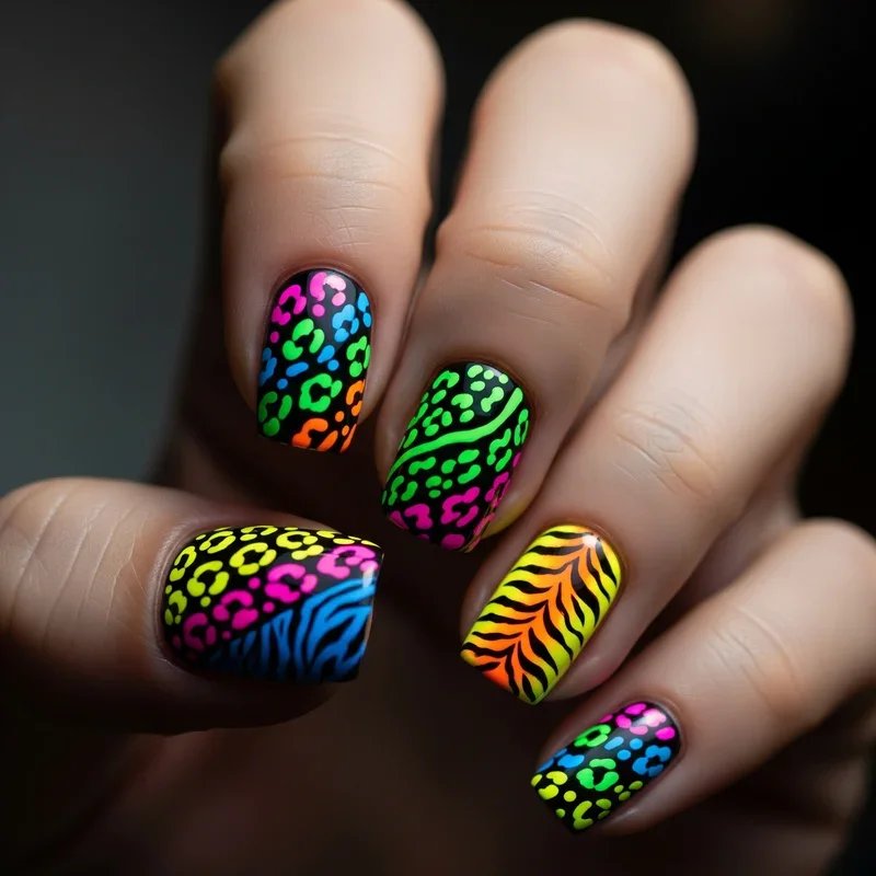 Unleash your wild side by combining classic animal prints with electrifying neon hues that nature never intended but totally should have! Zebra stripes in neon pink and green, leopard spots in electric blue and orange, or snake scales in fluorescent yellow create unexpected visual excitement. These designs prove that animal prints don't always have to follow conventional color rules. Using a thin nail art brush or dotting tool helps achieve precise patterns that look professionally done. The trick is choosing complementary neon shades that enhance rather than clash with each other. Whether you're channeling your inner party animal or just want nails that roar with personality, neon animal prints deliver that perfect balance of fierce and fabulous.