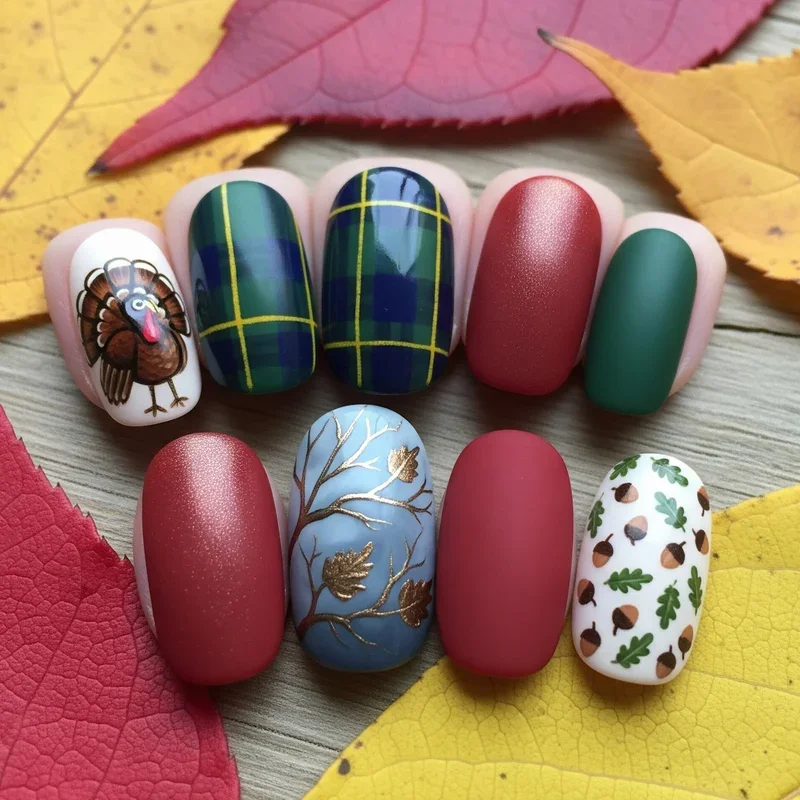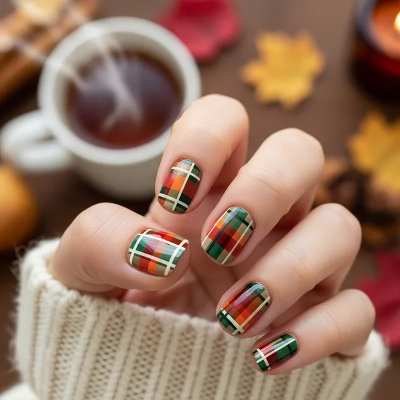 Who says plaid belongs only on flannel shirts? November plaid nails bring that cabin-in-the-woods feeling straight to your manicure. Creating plaid patterns might seem challenging, but thin striping tape makes it surprisingly achievable. Choose warm color combinations like red and black, orange and brown, or green and gold for authentic autumn vibes. The intersecting lines create visual interest while maintaining sophisticated appeal. You can plaid-ify all nails or use it as an accent on ring fingers only. This pattern pairs beautifully with solid colors on other nails for balanced design. Your hands will look ready for hayrides and apple picking adventures!