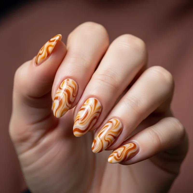 Imagine drizzling caramel over your favorite dessert, then capturing that sweetness on your nails! Caramel swirl designs bring warmth and movement to your November manicure with their flowing patterns. These designs work beautifully over nude or cream bases, creating depth without overwhelming your look. You'll love how the golden brown swirls catch light differently throughout the day. Mix various shades of caramel, from light toffee to deep amber, for dimension that rivals autumn sunsets. The organic patterns feel effortlessly chic while maintaining that cozy November aesthetic we all crave. Your nails become miniature works of art celebrating the season's sweet side.