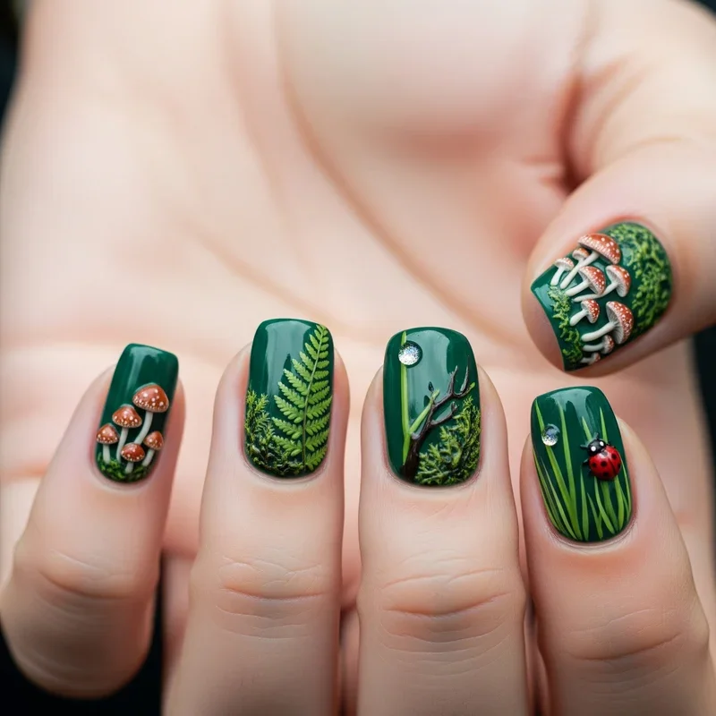 Bring the outdoors in with forest green nails that celebrate November's evergreen beauty before winter arrives. This deep, rich shade grounds your look while offering unexpected alternative to typical fall colors. Think pine trees against autumn sky or moss-covered forest floors. You can keep it simple with solid color or add gold leaf accents for luxe forest fairy vibes. The versatility of forest green surprises, pairing equally well with neutrals or jewel tones. This shade transitions seamlessly from day to night, office to weekend adventures. Your nails become little reminders of nature's enduring beauty even as November temperatures drop.