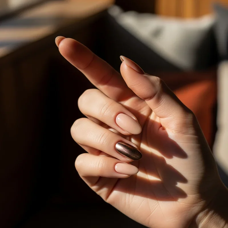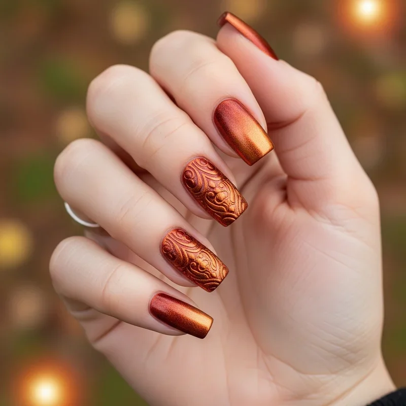 Make a statement with metallic bronze accent nails that catch November light like fallen leaves kissed by sun. Choose one or two nails per hand for bronze treatment while keeping others in complementary warm shades. The metallic finish adds instant glamour to any November manicure without overwhelming the overall look. Bronze works beautifully with burgundies, browns, and deep oranges for cohesive autumn palette. Try different metallic finishes from mirror chrome to subtle shimmer based on your style preference. These accent nails elevate simple manicures to special occasion worthy. Your hands sparkle with every gesture, bringing warmth and luxury to November days.