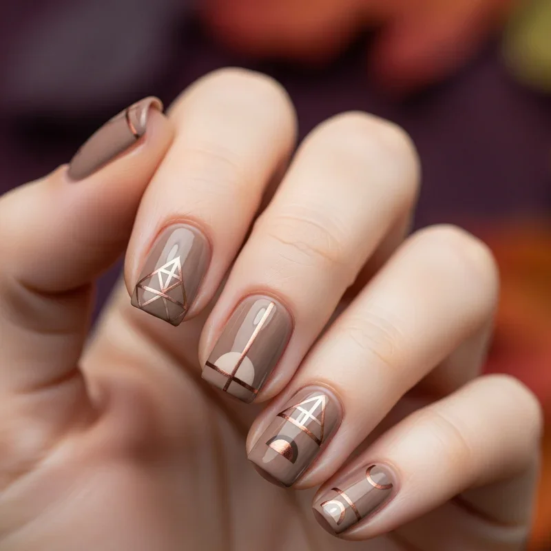Modern meets cozy with warm taupe geometric patterns that bring contemporary edge to November nails. This sophisticated neutral provides perfect backdrop for triangles, lines, and abstract shapes in darker browns or metallics. The geometric designs add visual interest while maintaining wearable appeal for daily life. Use nail tape for crisp lines or embrace imperfection with freehand designs for organic feel. Taupe's versatility means these patterns complement any wardrobe choice from casual to formal. Mix different geometric shapes across nails for cohesive yet varied look. Your November manicure becomes conversation starter that proves nail art can be both trendy and tastefully understated.