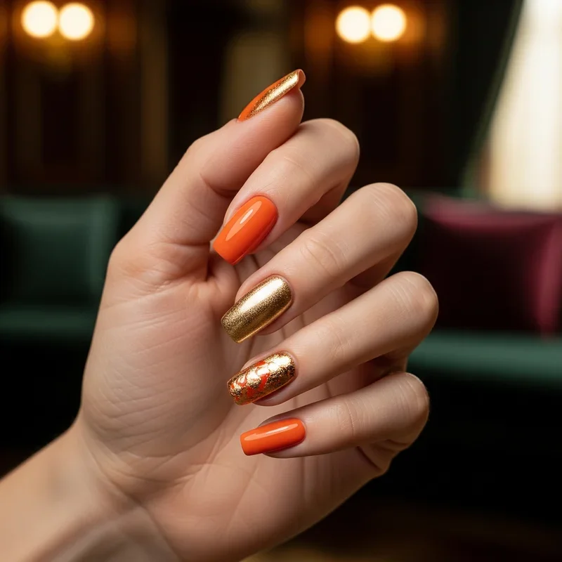 Talk about a power couple! Orange and gold together create a luxurious look that screams expensive taste without the expensive price tag. This combination works because warm orange tones naturally complement metallic gold, creating a harmonious blend that's both eye-catching and sophisticated. Try alternating orange and gold nails, or get creative with gold foil accents on an orange base. You could even do gold stripes, dots, or geometric shapes over orange polish. This combo is perfect for special occasions when you want to feel like royalty. It's giving major autumn vibes too, making it ideal for fall weddings or holiday parties. Your nails will look like they belong on a fashion runway!