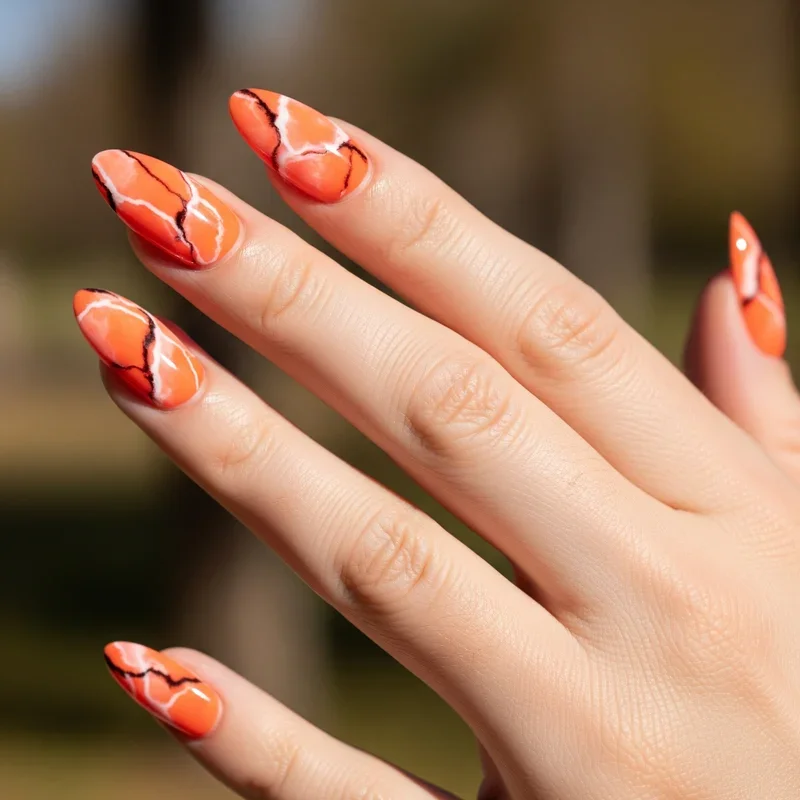 Want nails that look like they belong in an art gallery? Orange marble designs are where it's at! This technique creates stunning swirls and patterns that mimic natural stone, but with way more personality. Mix different shades of orange with white or cream to create that marbled effect. Each nail becomes a unique piece of art – no two will look exactly the same, and that's the beauty of it! The water marble technique might seem intimidating at first, but there are also easier methods using a toothpick or thin brush. These nails are conversation starters for sure. People will be asking if you got them done professionally!