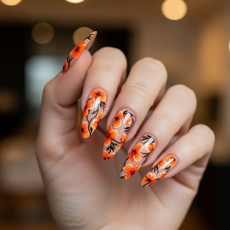Nothing says feminine and fun quite like floral nail art, and when you add orange to the mix? Pure magic! Orange flowers on a neutral base create a cheerful garden party vibe that's perfect for spring and summer. You can go realistic with detailed petals or keep it simple with abstract blooms. Mix orange flowers with green leaves for a tropical feel, or pair them with other warm colors for a sunset bouquet effect. Don't worry if you're not an artist – nail stickers and stamps make floral designs super accessible. These nails are guaranteed mood boosters. Every time you look down, it's like having a tiny garden at your fingertips!
