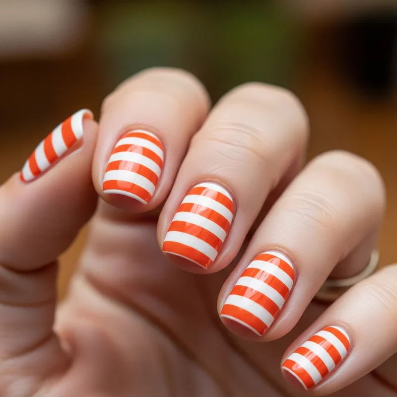 Who says nautical has to be navy and white? Orange and white stripes bring a fresh twist to the classic maritime look. This preppy-meets-playful design is perfect for summer yacht parties or just channeling those vacation vibes at your desk. You can go horizontal, vertical, or even diagonal with your stripes. Thin pinstripes look delicate and refined, while bold stripes make more of a statement. The contrast between bright orange and crisp white creates a look that's both clean and energetic. It's like wearing a stylish beach cabana on your nails! This design proves that sometimes the best ideas come from unexpected combinations.