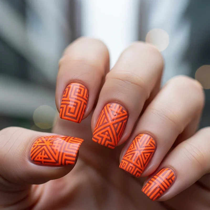 Clean lines and bold angles meet vibrant orange in this modern nail art trend that's taking over Instagram feeds everywhere. Geometric patterns in orange create a contemporary look that's both artistic and wearable. Think triangles, stripes, chevrons, or abstract shapes in various orange tones. You can keep it simple with negative space designs or go all out with complex patterns. Nail tape is your best friend here – it helps create those perfectly crisp lines that make geometric designs pop. This style works especially well if you're into minimalist fashion or love modern art. Your nails become like tiny architectural statements!