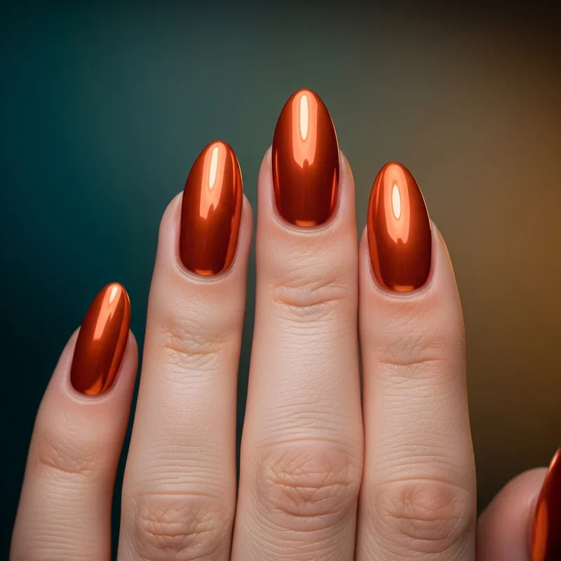 Step into the future with orange chrome nails that look like they're straight out of a sci-fi movie! This mirror-like finish takes orange to a whole new dimension, creating an ultra-modern look that's impossible to ignore. Chrome powder over orange polish creates this incredible metallic sheen that shifts and changes in different lights. It's like wearing liquid metal on your nails, but make it citrus! The effect is so mesmerizing, you might catch yourself staring at your own hands. Fair warning: these nails require a bit more maintenance and specific products, but the jaw-dropping results are absolutely worth the extra effort.