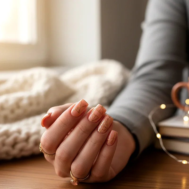 Elevate your nail art game with peach and gold geometric patterns that merge modern aesthetics with timeless elegance. Create triangles, diamonds, or abstract shapes using striping tape to achieve crisp, clean lines that look professionally done. The warm gold complements peach's softness while adding metallic sophistication that transforms simple nails into wearable art pieces. Alternate between negative space and filled shapes to create dynamic visual interest across all ten fingers. Consider using different geometric patterns on each nail while maintaining the peach and gold color scheme for cohesion. This style works particularly well for fashion-forward individuals who appreciate contemporary design elements. Seal your geometric masterpiece with a quality topcoat to prevent chipping and maintain those perfectly sharp edges longer.
