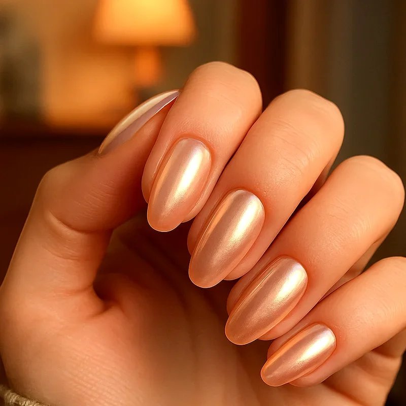 Step into the future with peach chrome nails that deliver mirror-like shine and otherworldly appeal to your fingertips. This trendy technique uses special chrome powders rubbed over tacky gel polish bases, creating metallic finishes impossible with traditional polishes. The peach chrome effect shifts between rose gold and copper tones depending on lighting, creating dynamic color play. While requiring UV lamps and specific products, the long-lasting results justify the investment for special occasions. The futuristic finish photographs incredibly, making it perfect for social media enthusiasts and fashion bloggers. Consider combining chrome accent nails with regular peach polish for a balanced look that doesn't overwhelm. This bold choice makes a statement while maintaining the peach palette's inherent warmth and approachability.