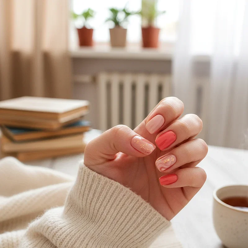 Why choose one peach shade when you can showcase an entire spectrum across your ten fingers? Select five different peach tones ranging from barely there blush to vibrant coral, creating an ombre effect across both hands. This approach celebrates peach's versatility while ensuring your manicure coordinates with every outfit in your closet. Arrange colors from light to dark, alternate between warm and cool undertones, or mix randomly for playful unpredictability. The monochromatic palette maintains sophistication while adding visual interest through tonal variation rather than pattern complexity. This technique works especially well for those who struggle choosing between polish colors at salons. Your mixed peach manicure becomes a conversation starter while proving that matching doesn't always mean identical.