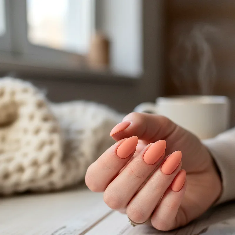 Experience the velvety sophistication of matte peach nails that offer unexpected texture and modern appeal to traditional glossy manicures. This finish transforms even the simplest peach shade into something extraordinary, creating an almost suede-like appearance that demands attention. Apply regular peach polish and add a matte topcoat, or invest in specially formulated matte peach polishes for optimal results. The absence of shine creates a subtle, understated elegance perfect for minimalists who still want something special. Matte finishes photograph beautifully and hide minor imperfections better than glossy alternatives, making them forgiving for DIY enthusiasts. Combine matte and glossy finishes on alternating nails for textural contrast that adds visual intrigue. Remember that matte nails show oils more easily, so regular touch-ups keep them looking fresh.