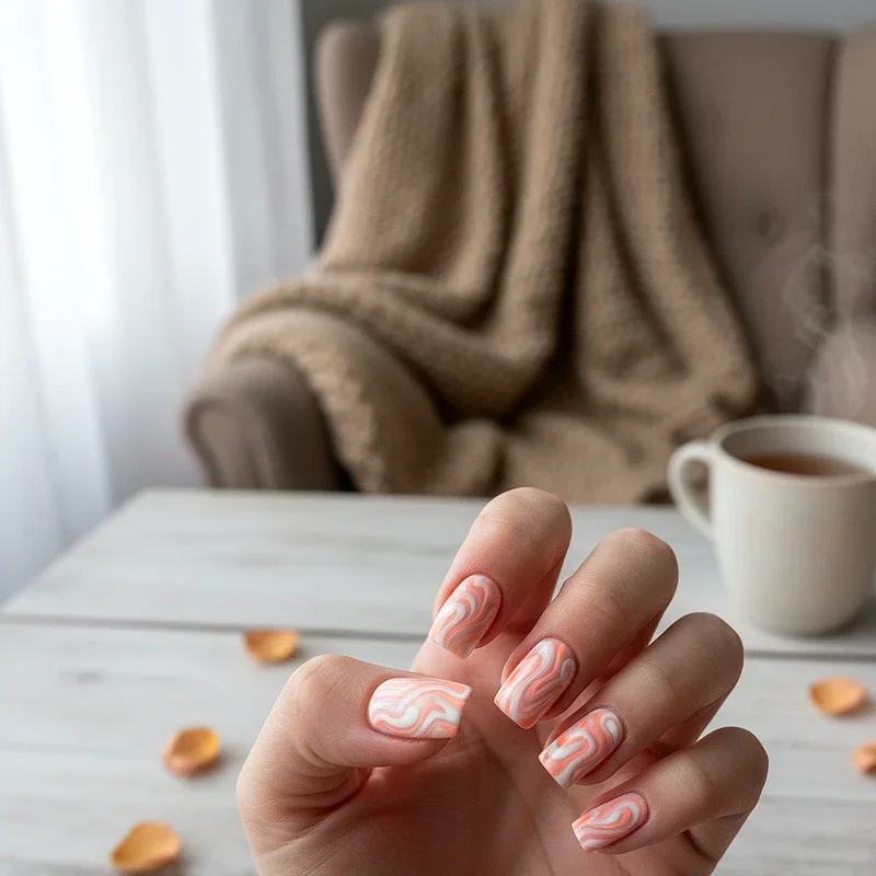 Dive into dreamy aesthetics with peach and white swirls that create mesmerizing patterns reminiscent of summer sorbet or cotton candy. Using a thin brush or toothpick, create flowing designs while polish remains wet, blending colors organically together. This technique produces unique results every time, ensuring your manicure remains one of a kind. The soft color combination feels romantic and whimsical without appearing overly sweet or childish. Consider adding tiny gold accents within swirls for extra dimension and luxury that elevates the entire design. This style particularly suits almond or oval nail shapes where curves complement the flowing pattern naturally. Finish with a high-gloss topcoat to smooth any texture and create a glass-like surface that showcases your artistic swirls.
