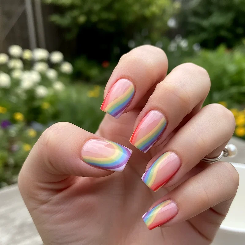 Complete the spectrum by incorporating pink and yellow as anchor colors in a full rainbow gradient across your nails. This design starts with yellow, flows through orange into pink, then continues through purple and blue for a complete color journey. The technique requires patience and careful blending to achieve smooth transitions between each color phase. Using a makeup sponge helps create seamless gradients while maintaining color intensity throughout the rainbow progression. This bold design celebrates color diversity while highlighting the natural harmony between pink and yellow within the spectrum. The result creates a joyful statement that spreads happiness wherever your hands travel throughout your day.